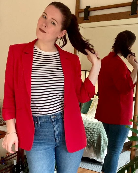 I’ve been wearing the unicorn t-shirt with my red Cinq et Sept Khloe blazer, which is the blazer of my dreams. Red is my color and this blazer hits all the key points. It’s the right length, it has ruched ¾ length sleeves, it’s quality material, it’s not too tight in the shoulders, and it is the right shade of red. To give credit where it is due, I thank Chase Amie for talking up this brand and bringing my attention to it. Blazers are not cheap, but I trusted her recommendation and got it on sale. I would 100% pay full price for another one in the future.